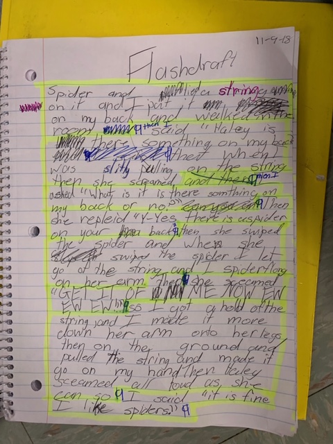 Fifth grade writers have been working hard to revise and edit their personal narratives. Black is to begin writing; blue is make the writing better; red is to make the writing right. Students also used highlighters to chunk their personal narratives into paragraphs.